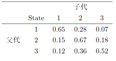 现在我们不观察整个社会在不同阶层的分布了,而是集中到一个人和他的后代上。初始的分布$\pi(0)$对应的就是最初的这一个人落在不同阶层的概率。让这个人按这个概率落在一个阶层上,比如阶层1,那么他的后代就会按照状态转移矩阵的第一列对应的概率落在不同的阶层上。按照第一种情况,在第7代时整个社会的分布收敛到了平稳分布,也就是说第七代后代落在三个阶层的概率与第八代后代落在三个阶层的概率是一样的,与后面所有后代落在三个阶层的概率也是一样。那么如果把这个人第七代后代之后很多代的子孙所处的阶层记录下来,我们就得到了一组服从平稳分布的样本。