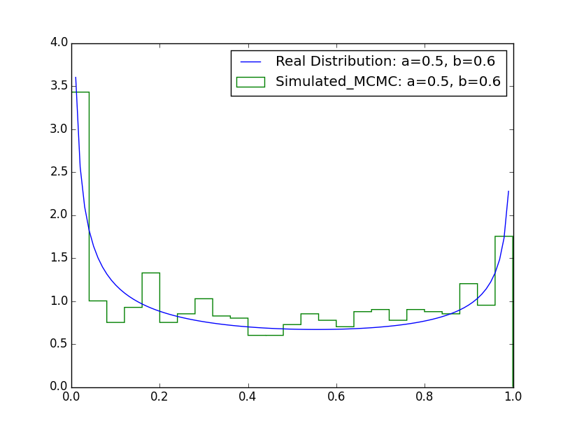 - 如果$u<alpha(x_t,y)=min \left\{ \frac{y ^{\alpha-1}(1-y) ^{\beta-1}}{x_t ^{\alpha-1}(1-x_t) ^{\beta-1}},1 \right\}$,则接受转移$X_t \rightarrow y$,即$X_{t+1}=y$