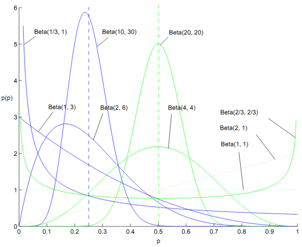 - Beta分布做先验分布,样本信息服从二项分布时,两种分布符合良好的特性可以简化计算。