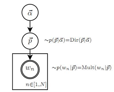 假如语料库中的无重复的词语数量是N,每一个词在所有文档中出现的次数为$n_i$,那么$\vec{n}=(n_1,\cdots,n_N)$正好是一个多项分布,整个语料库生成的概率为 $$p(W)=p(\vec{n})=Mult(\vec{n}|\vec{p},N)=\coprod _{i=1} ^{N} p_i ^{n_i}$$