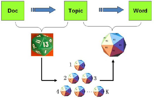 那么我们不妨将文档看做是一些词的集合,那么最简单的生成文档的方式就是,先选定这篇文档的词语个数N,然后选N个词出来。这一过程就好像是我们有一个巨大的多面体,它有字典里的词那么多面,每一面对应一个词。当我们要创作一篇有N个词的文档时,我们就把这个多面体扔N次,然后文档就生成了。