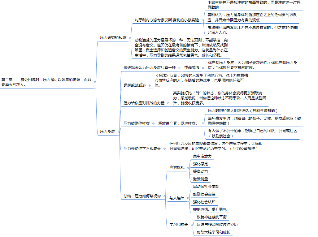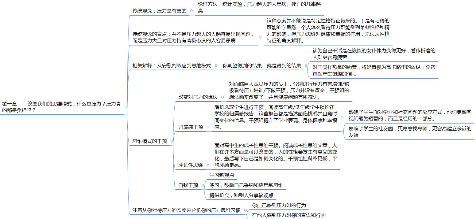 整本书的中心思想是:改变对压力的看法,会使你更健康和幸福。文中通过大量的社会学实验作为论据来证明论点。内容的展开都是从实验的角度出发,探讨面对压力时不同的态度导致的不同的生理性反映,干预和对比来说明实验的合理性。大量的例证让论证看起来很丰富,但缺少体系的结构设计和略显重复的实验内容让人看起来也有些疲惫。